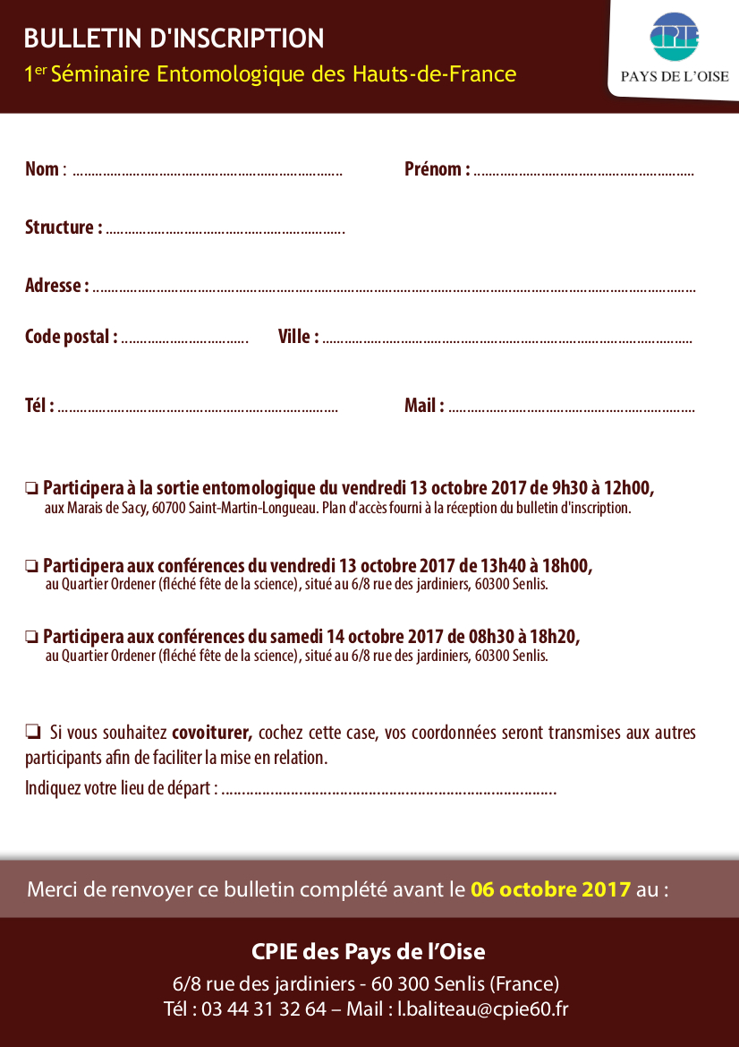 Le bulletin d’inscription est téléchargeable ci-dessous et est à renvoyer avant le 6 octobre 2017 au CPIE des Pas de l’Oise (6/8 rue des jardiniers - 60300 Senlis) ou par mail à l.baliteau@cpie60.fr