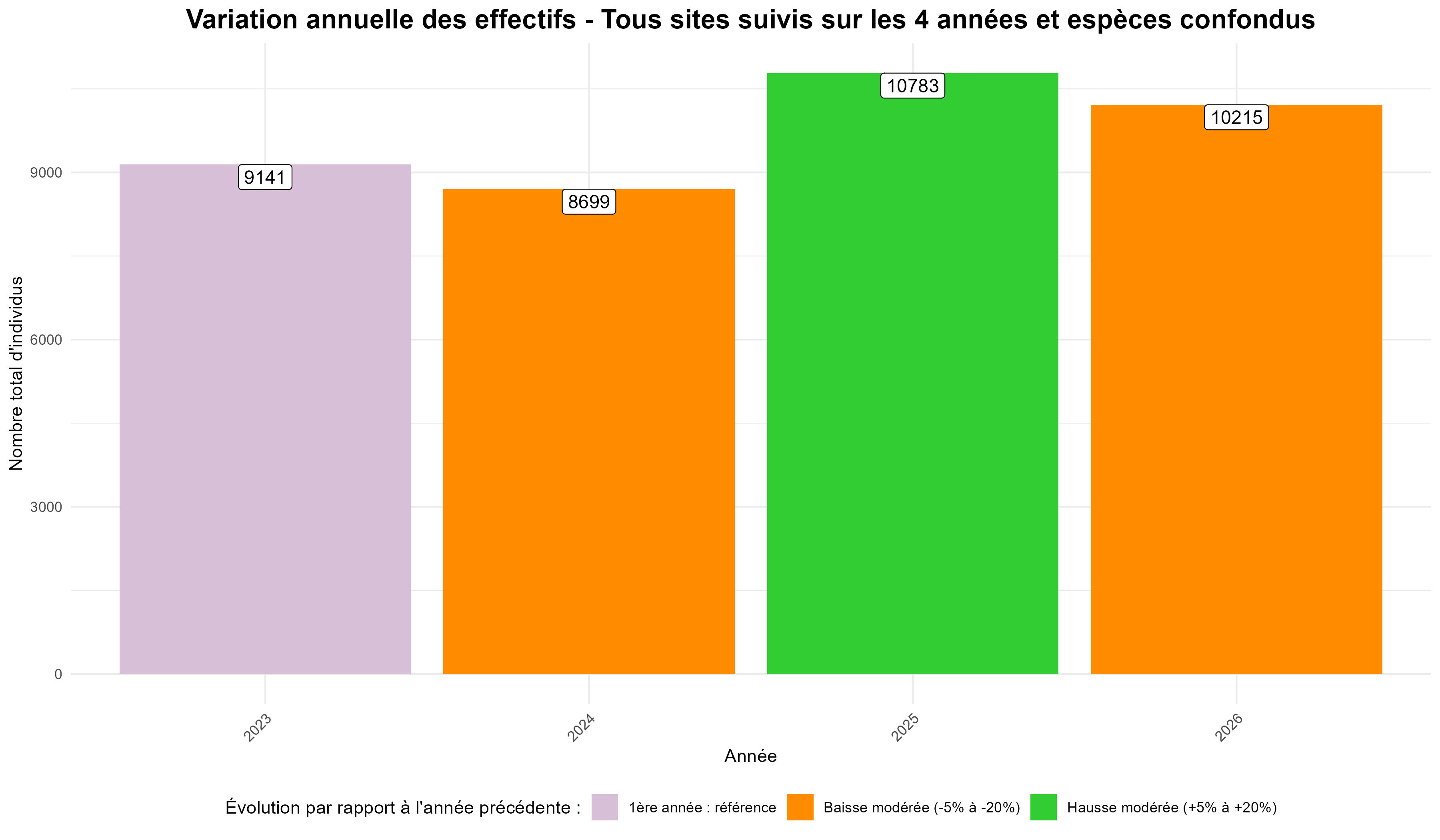 Dans le tableau suivant, sont présentés les effectifs par espèce, recensés sur les 45 sites suivis de manière consécutive, de 2023 à 2026.