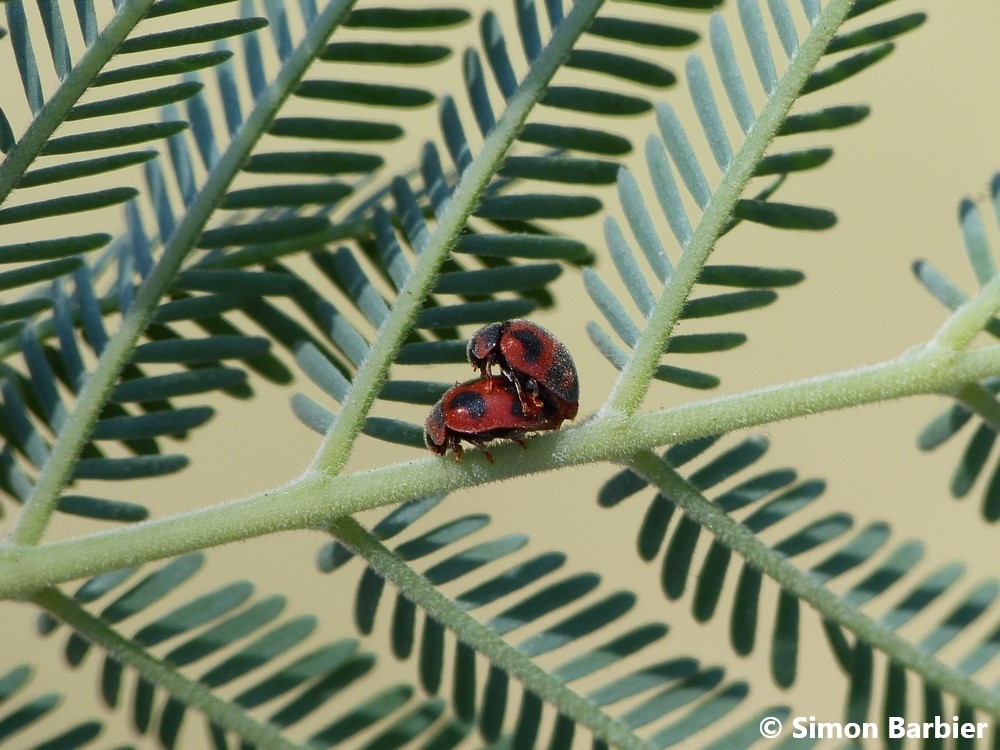Novius cardinalis (photo ci-dessous) est une espèce australienne introduite pour la lutter contre la cochenille australienne (Icerya purchasi) présente sur certaines plantes ornementales (Oranger du Mexique) ou sur les agrumes (Citronnier, Oranger). Les plantes d’ornements sont souvent utilisées dans les parterres décoratifs et dans les haies des villages, une vigilance particulière sera donc nécessaire pour étudier l’évolution de la répartition de cette espèce dans les Hauts-de-France. Les périodes favorables pour trouver les larves et les adultes de cette espèce sont de septembre à octobre lors de la floraison de l’Oranger du Mexique et de la maturation des autres arbres à agrumes.