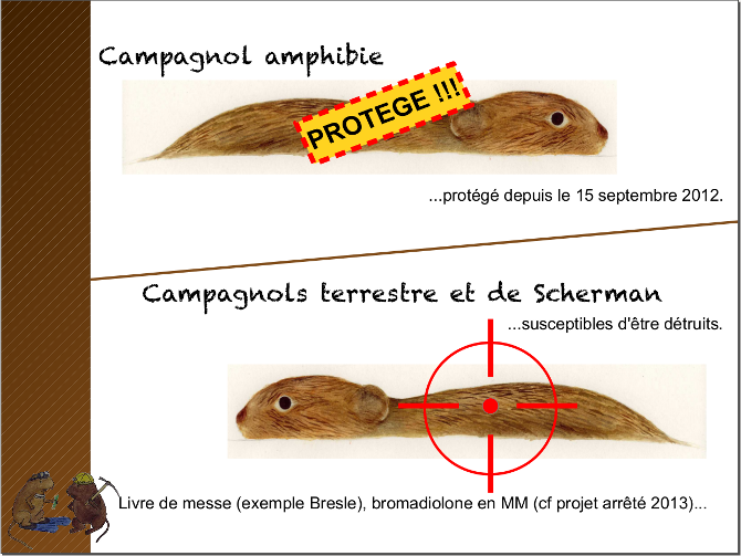 Par contre les Campagnols terrestre et de Scherman ne sont eux pas protégés. Le Campagnol de Scherman fait même l’objet d’une lutte par empoisonnement organisée dans certains départements.