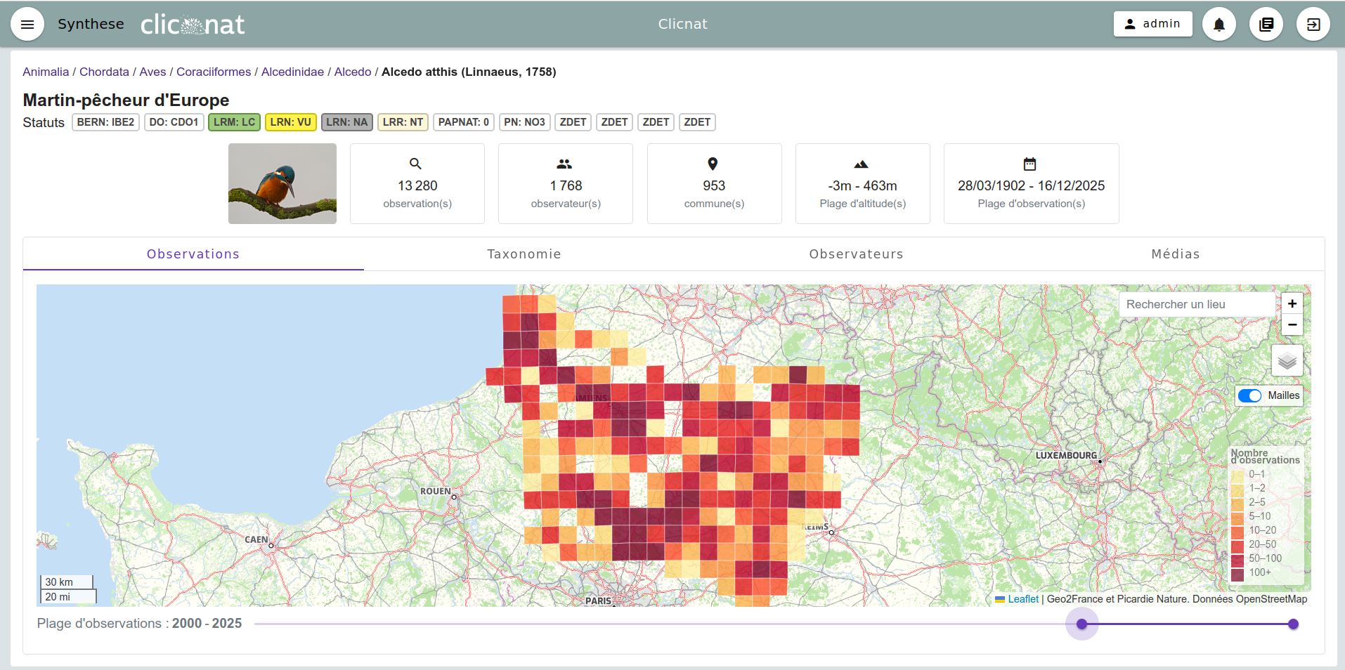 Ajoutées dans la version 2.15 et améliorées dans la version 2.16, les Fiches taxon font leur apparition dans GeoNature. Elles centralisent toutes les informations disponibles dans Clicnat au sujet d’un taxon : mailles de présence, statuts taxonomiques, liste des observateurs, et médias.