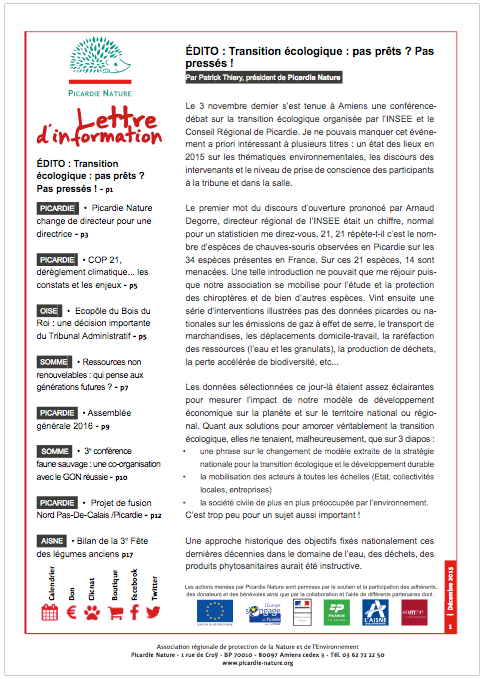 Vous trouverez ci-joint, la lettre d’information de décembre ainsi qu’unlien vers un dossier de presse sur le déréglement climatique : les constats et les enjeux en Picardie.