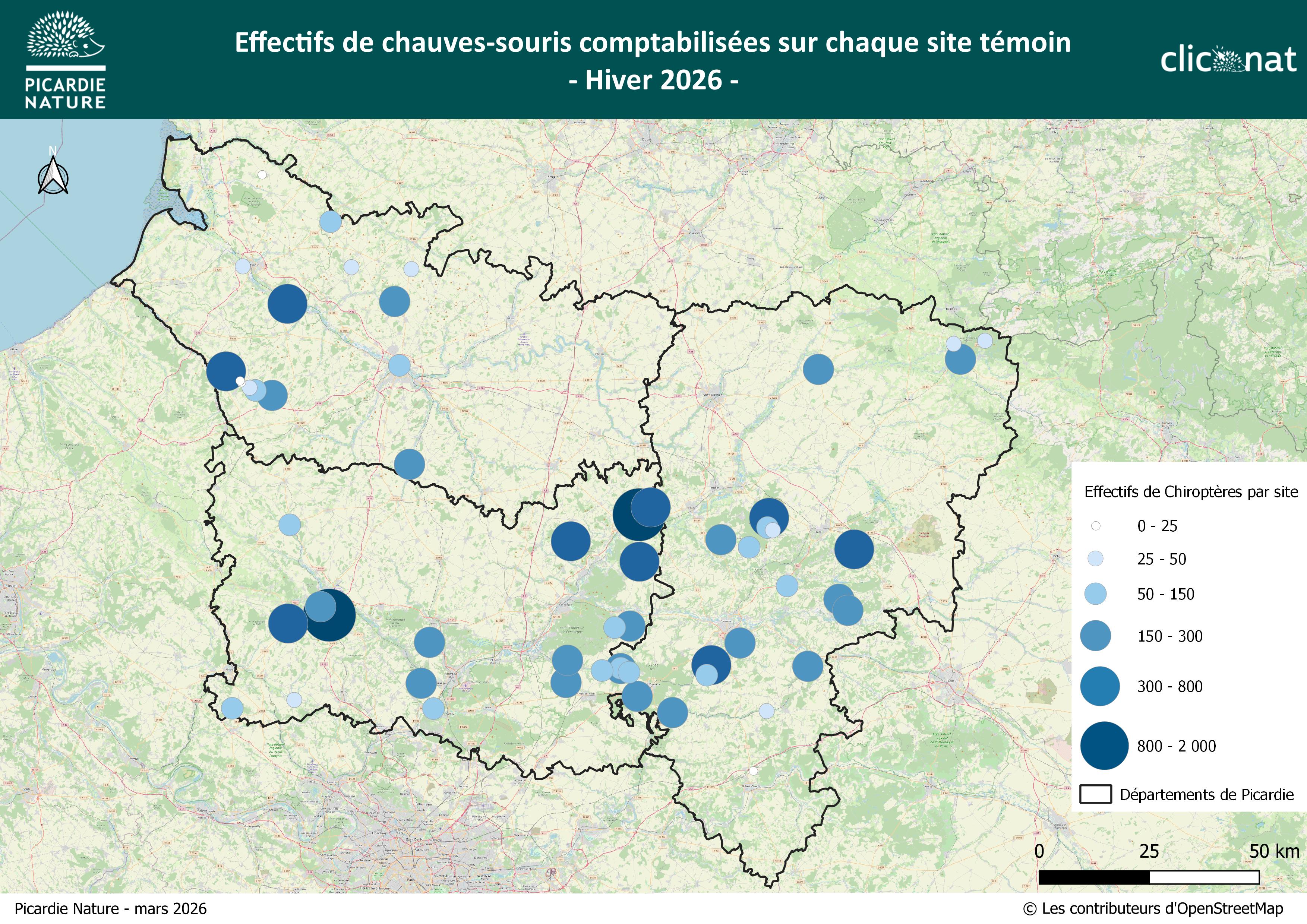 Sont présentés ci-après dans la figure suivante, les effectifs de chauves-souris recensés durant les suivis hivernaux de 2026. Les sites majeurs apparaissent ainsi en évidence, ce qui permet de visualiser d’un point de vue globale, la répartition des effectifs importants, sur l’ensemble de la Picardie. Ainsi, 2 sites témoins majeurs sont mis en évidence dans l’Oise, avec plus de 1 000 individus recensés. S’ensuit de 9 sites répartis dans toute la Picardie, comptabilisant entre 300 et 800 chauves-souris.