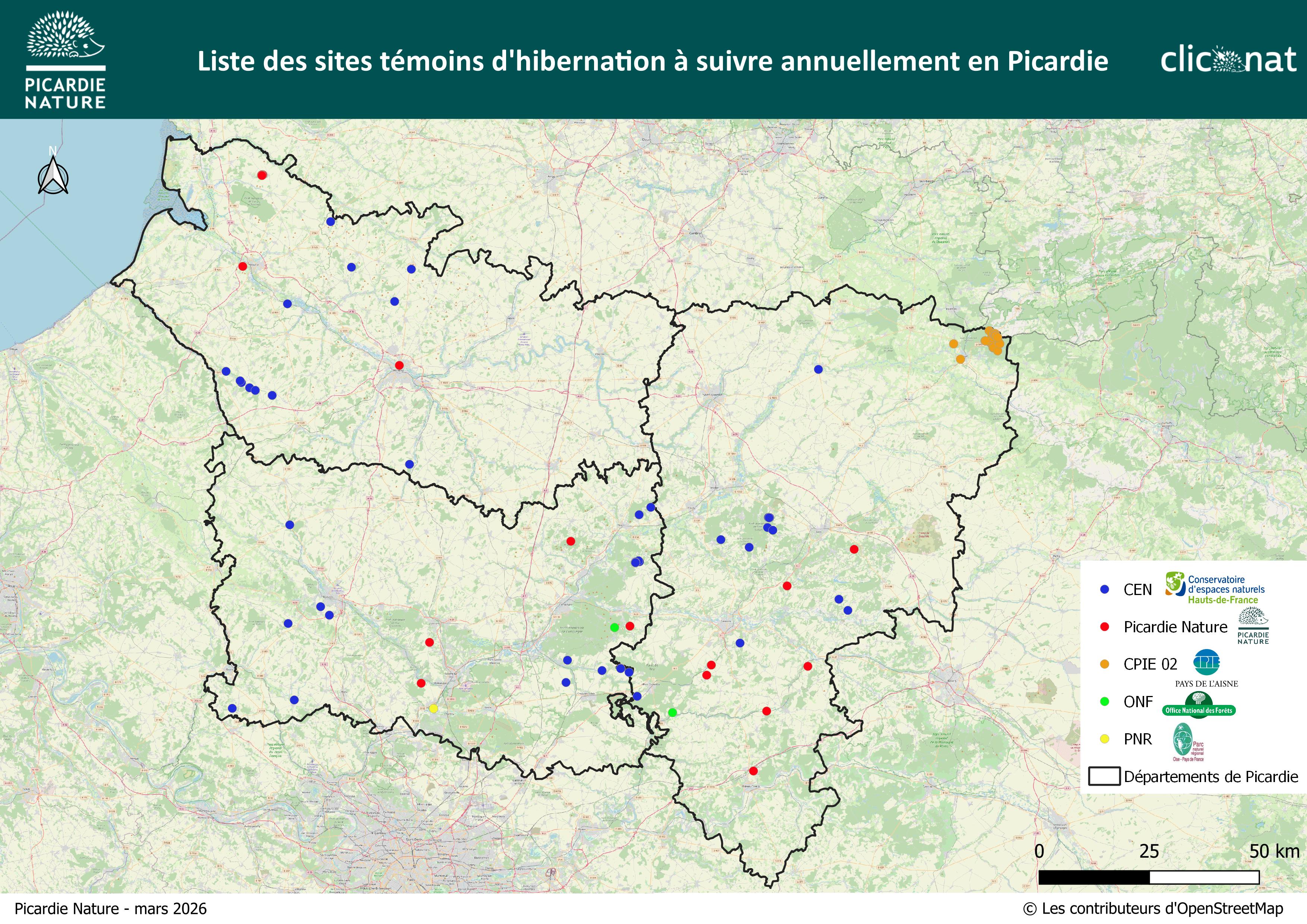 Initialement, 70 sites témoins d’hibernation ont été définis en concertation avec les partenaires. Fin 2023, la nouvelle liste affiche 52 sites ou groupes de sites prioritaires à suivre, puis se revoit diminuée en 2026 avec 51 sites. Cela concerne 20 sites dans l’Aisne, 21 sites dans l’Oise et 10 sites en Somme (voir carte), Picardie Nature effectue le suivi de 15 de ces sites.