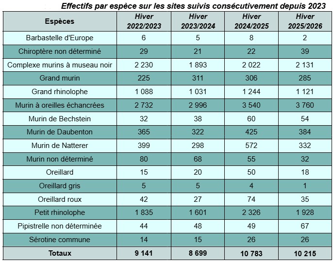 Dans le tableau suivant, sont présentés les effectifs par espèce, recensés sur les 45 sites suivis de manière consécutive, de 2023 à 2026.