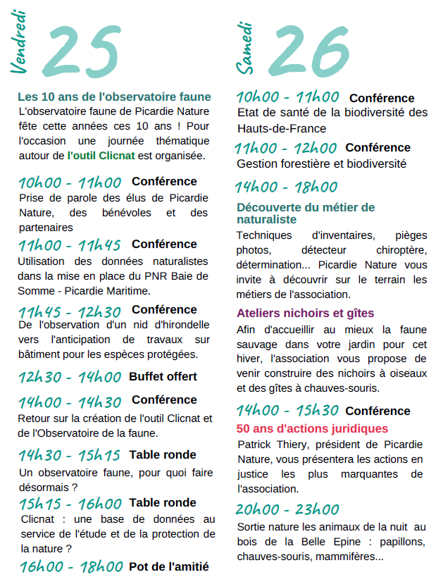 Pour fêter dignement les 50 ans de Picardie Nature et les 10 ans de l’Observatoire faune, nous organisons du 23 au 27 septembre de nombreuses activités au Centre d’accueil et d’hébergement de Dury.